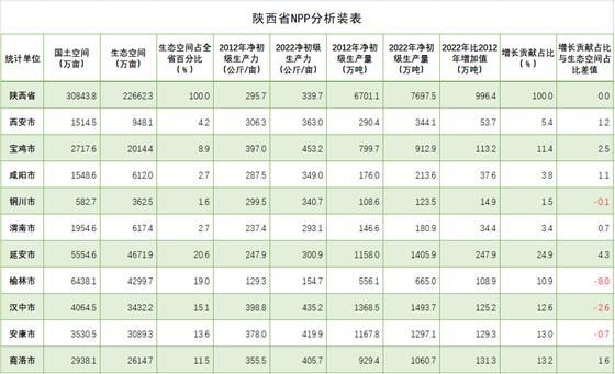 全省元生產(chǎn)力區(qū)域分析結(jié)果表明,在三大區(qū)域生態(tài)蛋糕越來越大的同時,生態(tài)蛋糕的空間布局上與結(jié)構(gòu)發(fā)生變化,呈現(xiàn)黃河流域綠色崛起大趨勢。陜北榆林、延安兩市,生態(tài)空間8971.6萬畝,占全省的39.6%;關(guān)中西安、寶雞、咸陽、渭南、銅川五市生態(tài)空間4554.5萬畝,占全省的29.2%;陜南漢中、安康、商洛三市生態(tài)空間9136.2萬畝,占全省的40.2%。2022年,陜北兩市提供了2070.9萬噸植被凈初級生產(chǎn)量,占全省的26.9%,比2012年的1714.1萬噸增加313.8萬噸,增長18.3%,在全省份額上升了1.3個百分點;關(guān)中五市提供了1775.1萬噸的植被凈初級生產(chǎn)量,占全省的23.1%,比2012年的1524.3萬噸250.8萬噸,增長16.4%,在全省份額上升了0.3個百分點;陜南三市提供了3851.5萬噸植被凈初級生產(chǎn)量,占全省的50.0%,比2012年的3462.7萬噸增加388.8萬噸,增長11.2%,在全省份額下降了1.6個百分點。2012-2022年全省新增生態(tài)蛋糕996.4萬噸,陜北兩市貢獻31.5%,關(guān)中五市貢獻29.5%,陜南三市貢獻39.0%。陜北、關(guān)中提供的生態(tài)蛋糕占全省的份額已由2012年的48.4%提高到2022年的50.0%。