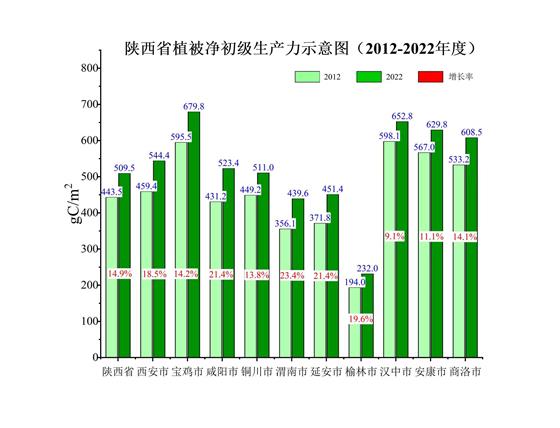 2012-2022年分市元生產(chǎn)力增長率分析結(jié)果表明,新時代10年,全省各市生態(tài)蛋糕越做越大,元生產(chǎn)力均有不同程度增長。有關(guān)中東大門之稱的渭南是全省元生產(chǎn)力增長最快的市,增長率為23.4%,從2012年237.4公斤/畝,增加到2022年的293.1公斤/畝,增加55.7公斤/畝;咸陽、延安增長率均為21.4%,并列全省第二,分別由2012年的287.5公斤/畝、247.9公斤/畝,增加到2022年的349.0公斤/畝、300.9公斤/畝,分別增加61.5公斤/畝、53公斤/畝。榆林居第四,增長19.6%。其后,依次分別西安增長18.5%,寶雞14.2%,商洛14.1%,銅川13.8%,安康11.1%,漢中9.1%。