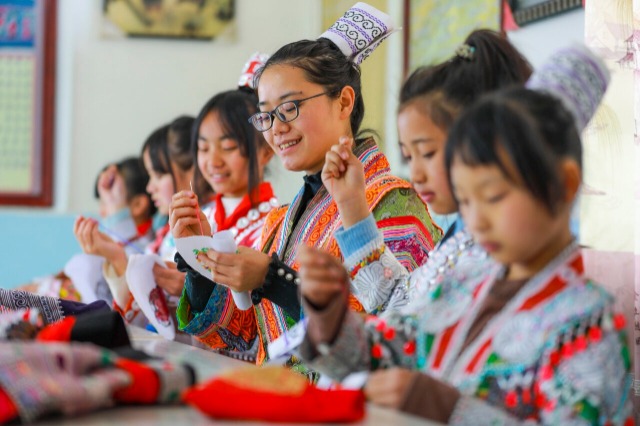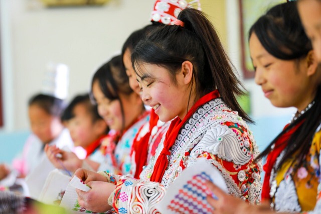 近年來,貴州省黔西市新仁苗族鄉(xiāng)折溪小學積極推動優(yōu)秀非遺文化進課堂,選任學校精通刺繡、蠟畫、蠟染的教師指導(dǎo)學生學習,讓苗族孩子們“零距離”接觸非遺技藝,弘揚和傳承民族優(yōu)秀傳統(tǒng)文化。中國教育報-中國教育新聞網(wǎng)通訊員 周訓超 攝