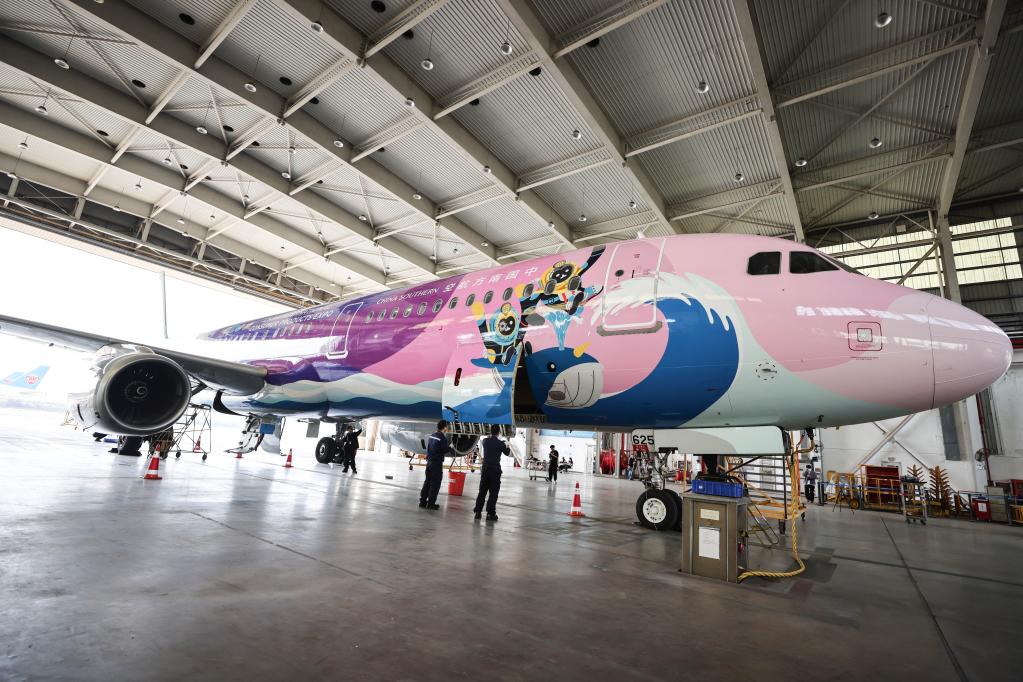 2023年3月7日,在海口美蘭國際機(jī)場,南航機(jī)務(wù)人員對“消博號”彩繪飛機(jī)進(jìn)行深度檢查。新華社記者 張麗蕓 攝