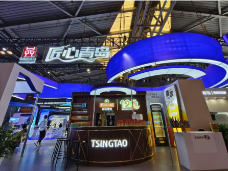 與往年展會不同,青島啤酒在展臺設(shè)計(jì)上,一枚紅、綠、金三色勾勒的120周年紀(jì)念標(biāo)識,格外引人注目,試飲杯中、啤酒泡沫上,紀(jì)念標(biāo)識的拉花與之呼應(yīng)成趣。