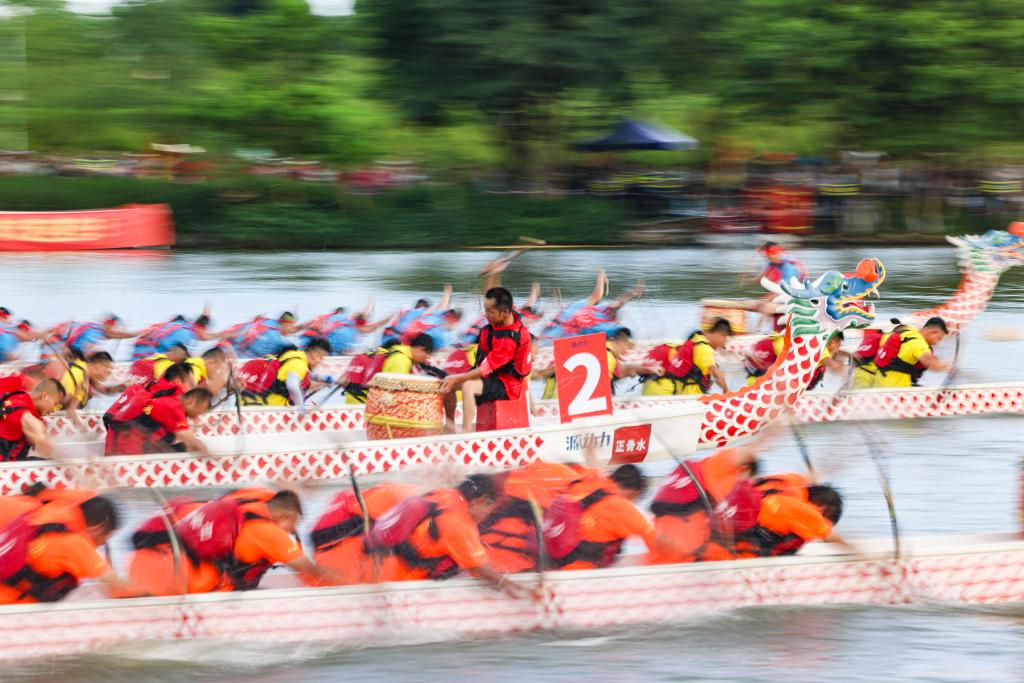 6月20日,在廣西玉林園博園,選手進行龍舟競賽。新華社記者 胡星宇 攝