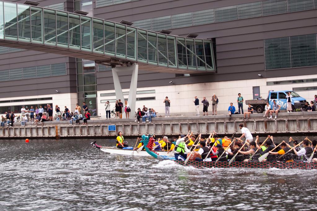 6月18日,在丹麥哥本哈根南港碼頭舉行的第六屆哥本哈根龍舟文化節(jié)上,人們比賽劃龍舟。新華社發(fā)