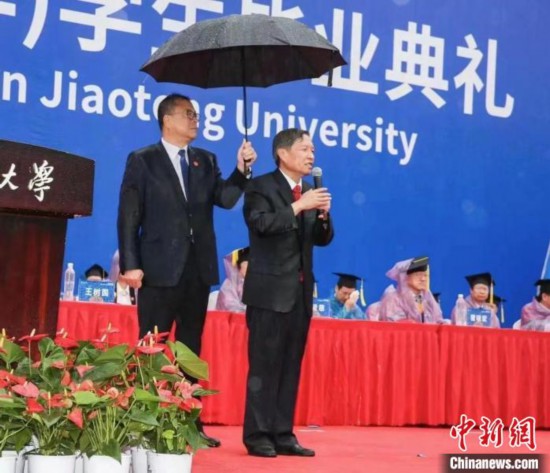 圖為西安交通大學(xué)畢業(yè)典禮當(dāng)日,該校黨委書(shū)記盧建軍為校長(zhǎng)王樹(shù)國(guó)撐傘。 西安交通大學(xué)供圖
