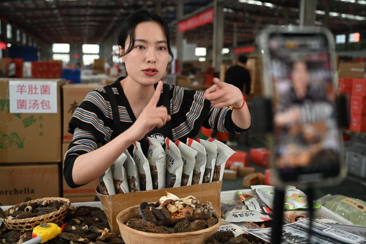 福建省寧德市近年來加大電商人才培育,推動鄉(xiāng)村振興和經(jīng)濟(jì)高質(zhì)量發(fā)展。圖為不久前的一處農(nóng)產(chǎn)品深精加工車間內(nèi),當(dāng)?shù)匾幻娚讨鞑フ诮榻B羊肚菌產(chǎn)品。新華社記者 林善傳攝