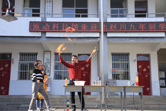付佳樂與指導(dǎo)教師一起為丹鳳縣武關(guān)鎮(zhèn)北趙川九年制學(xué)校展示趣味科學(xué)實(shí)驗(yàn)。受訪者供圖