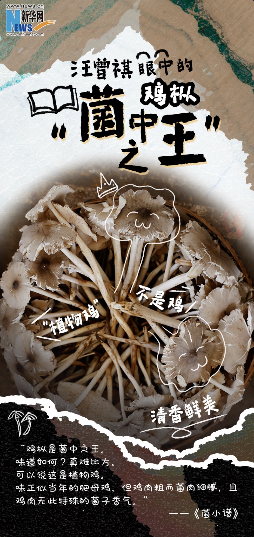 雞樅是當(dāng)之無(wú)愧的菌中之王,味道鮮濃,無(wú)可方比。在《昆明的吃食》一文中,汪曾祺記錄下了許多他鐘愛的美食。談及雞樅,他說(shuō):“雞樅有一股清香,入口無(wú)渣,甚滑。”在品嘗雞樅后,更是用“腴”一字概括雞樅的鮮美口感。