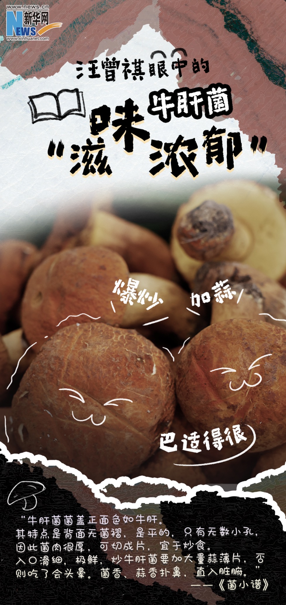 牛肝菌,色如牛肝,滑、嫩、鮮、香,較之于其他菌,肥碩鮮美,滋味濃郁,吃起來(lái)有肉的質(zhì)感,聞起來(lái)有土壤的清香。但是牛肝菌迷人也危險(xiǎn),在炒熟的情況下,汪老建議“炒牛肝菌須多放蒜”。
