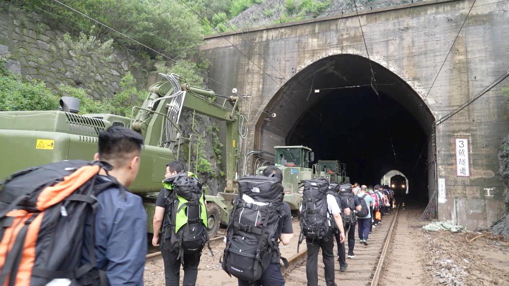 隨后,突擊隊成員徒步攜帶生活物資向安家莊站、落坡嶺站行進(jìn)。身負(fù)30至40斤背包,沿著受損的鐵路線,徒步11余公里,穿越7個隧道,為安家莊站、落坡嶺站滯留旅客及時送去物資。