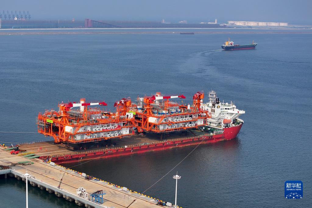這是8月9日在天津濱海新區(qū)拍攝的渤中19-6凝析氣田I期開發(fā)項目組塊裝船作業(yè)現(xiàn)場。組塊裝船后將赴渤海西部海域,進入海上安裝和聯(lián)調(diào)階段。新華社發(fā)(杜鵬輝攝)