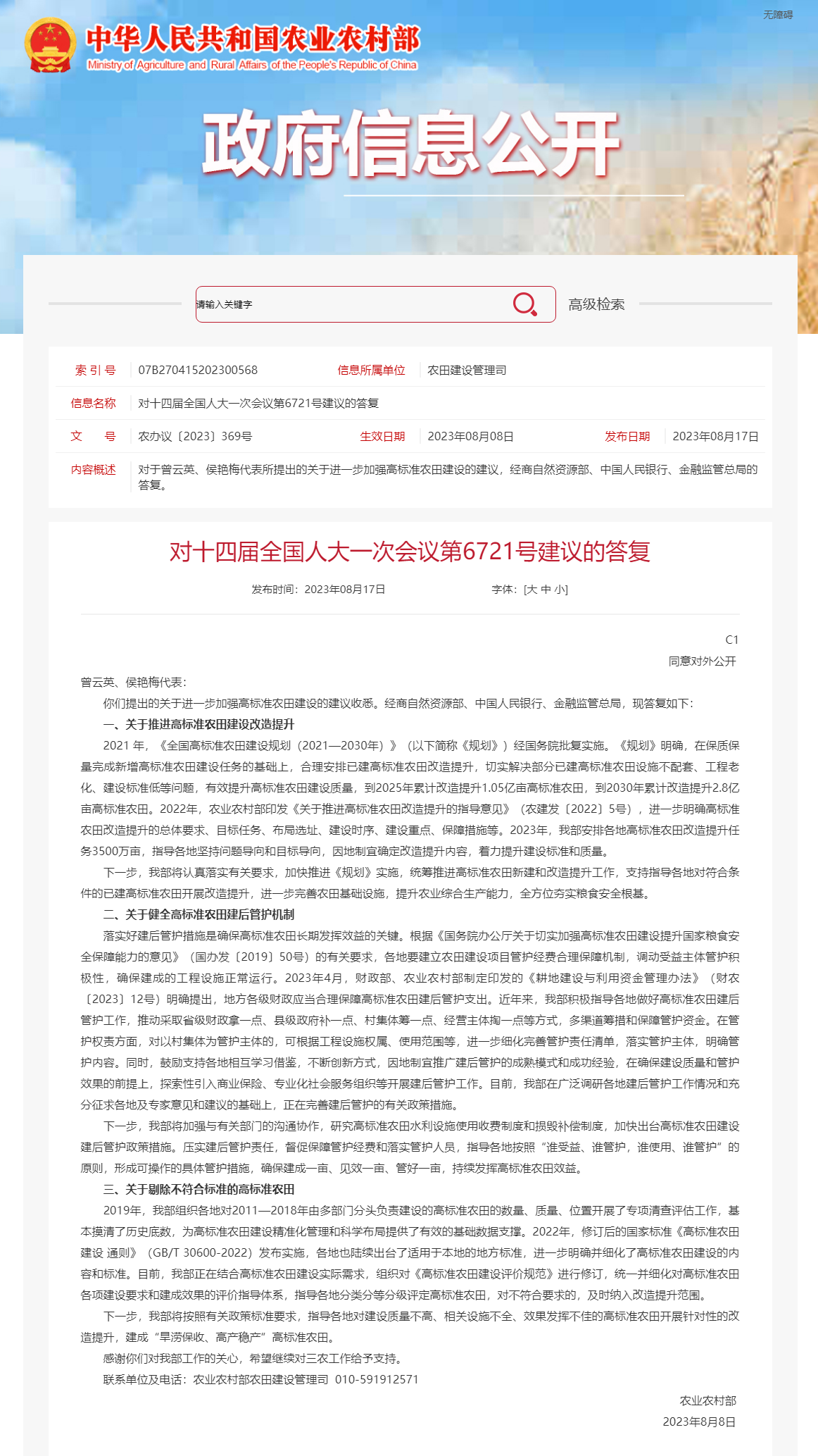 央視網(wǎng)消息:8月17日,農(nóng)業(yè)農(nóng)村部公布對(duì)十四屆全國(guó)人大一次會(huì)議第6721號(hào)建議的答復(fù)。其中提出,下一步,農(nóng)業(yè)農(nóng)村部將加強(qiáng)與有關(guān)部門(mén)的溝通協(xié)作,研究高標(biāo)準(zhǔn)農(nóng)田水利設(shè)施使用收費(fèi)制度和損毀補(bǔ)償制度,加快出臺(tái)高標(biāo)準(zhǔn)農(nóng)田建設(shè)建后管護(hù)政策措施。壓實(shí)建后管護(hù)責(zé)任,督促保障管護(hù)經(jīng)費(fèi)和落實(shí)管護(hù)人員,指導(dǎo)各地按照“誰(shuí)受益、誰(shuí)管護(hù),誰(shuí)使用、誰(shuí)管護(hù)”的原則,形成可操作的具體管護(hù)措施,確保建成一畝、見(jiàn)效一畝、管好一畝,持續(xù)發(fā)揮高標(biāo)準(zhǔn)農(nóng)田效益。