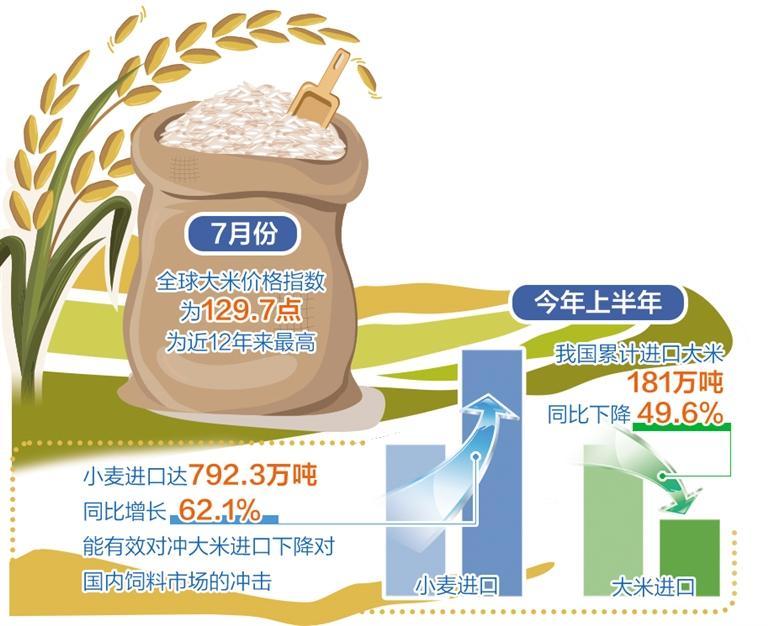 “為了確保大米進(jìn)口穩(wěn)定性,我國(guó)各類進(jìn)口主體也在推進(jìn)大米進(jìn)口多元化,避免來(lái)源地和品種過(guò)于集中帶來(lái)的進(jìn)口安全風(fēng)險(xiǎn)。”彭超說(shuō)。一方面,推進(jìn)大米進(jìn)口來(lái)源地多元化。我國(guó)大米進(jìn)口來(lái)源地包括越南、緬甸、泰國(guó)、印度、巴基斯坦、柬埔寨等主產(chǎn)國(guó)。從去年10月起,我國(guó)開(kāi)始逐步減少印度碎米進(jìn)口,印度已從過(guò)去幾年中國(guó)最大的大米供應(yīng)商滑落至第四位。另一方面,推進(jìn)糧食進(jìn)口品種多元化。減少大米進(jìn)口的同時(shí),增加飼用小麥進(jìn)口。今年上半年,我國(guó)小麥進(jìn)口量達(dá)到792.3萬(wàn)噸,較去年同期增長(zhǎng)62.1%,能夠有效對(duì)沖大米進(jìn)口下降對(duì)國(guó)內(nèi)飼料市場(chǎng)的沖擊。