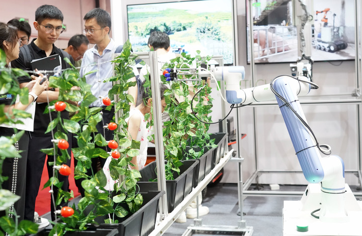 在農(nóng)業(yè)展區(qū),碩大的果園多臂采摘機(jī)器人引人注目。機(jī)械手臂通過位置和光感靈敏伸出準(zhǔn)確抓住一個(gè)蘋果,讓觀眾對農(nóng)業(yè)現(xiàn)代化和智能化有了更直觀的了解。這款機(jī)器人由北京市農(nóng)林科學(xué)院智能裝備技術(shù)研究中心研制,通過機(jī)械臂和果實(shí)獲取裝置,實(shí)現(xiàn)采果、納果、儲果全程自動化采收,并具備晝夜連續(xù)作業(yè)的能力,每小時(shí)可以采摘400至550果,大幅提升了采摘效率。