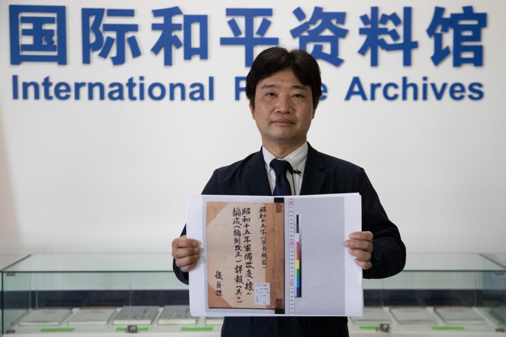 6月1日,在黑龍江外國語學(xué)院國際和平資料館,日本學(xué)者松野誠也展示新發(fā)現(xiàn)的資料。此前,黑龍江外國語學(xué)院和侵華日軍第七三一部隊(duì)罪證陳列館聯(lián)合在哈爾濱市向社會公布了一批部隊(duì)編制資料。這些資料包括關(guān)東軍防疫給水部軍官高等文官職員表、判任文官同待遇者職員表等。新華社記者張濤攝