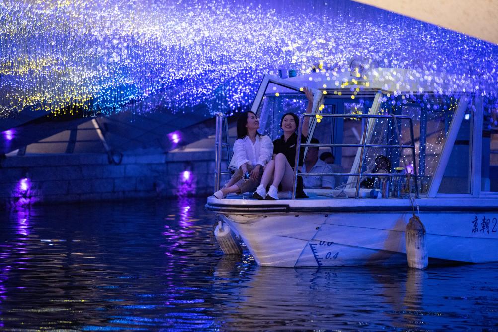 這是人們乘坐北京亮馬河游船經(jīng)過(guò)被裝點(diǎn)成“星空”的好運(yùn)橋。 新華社記者 陳鐘昊 攝