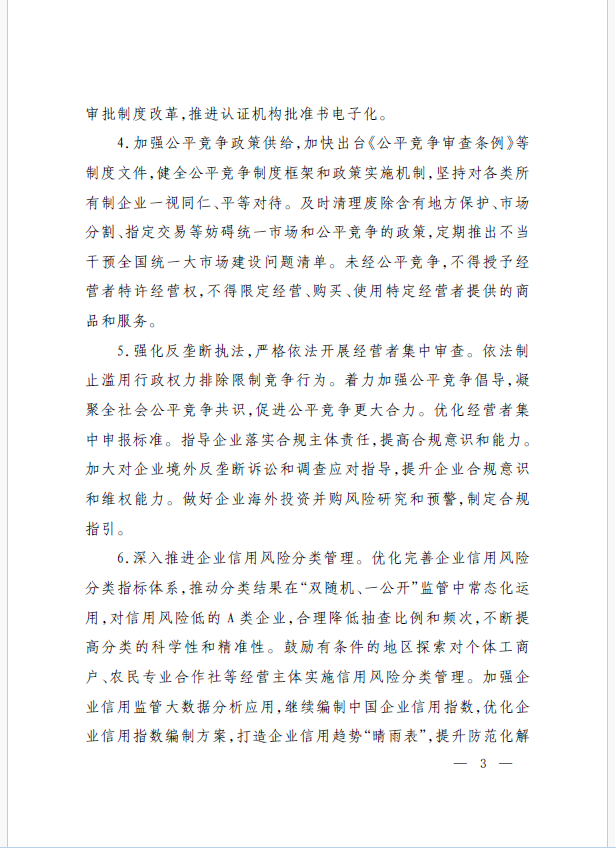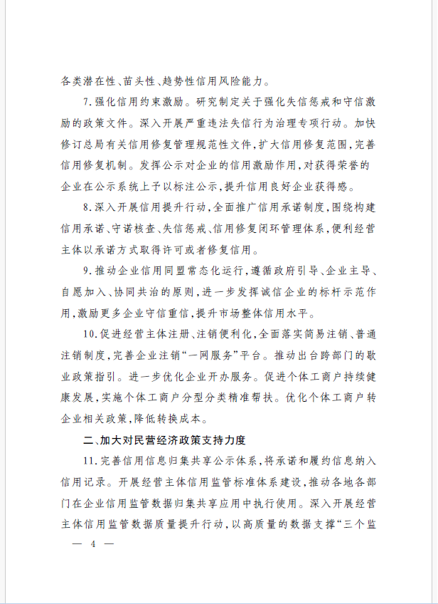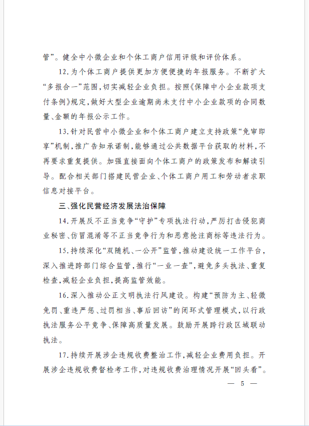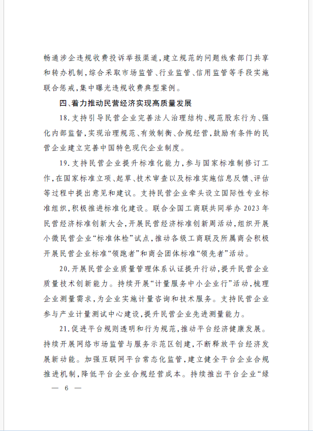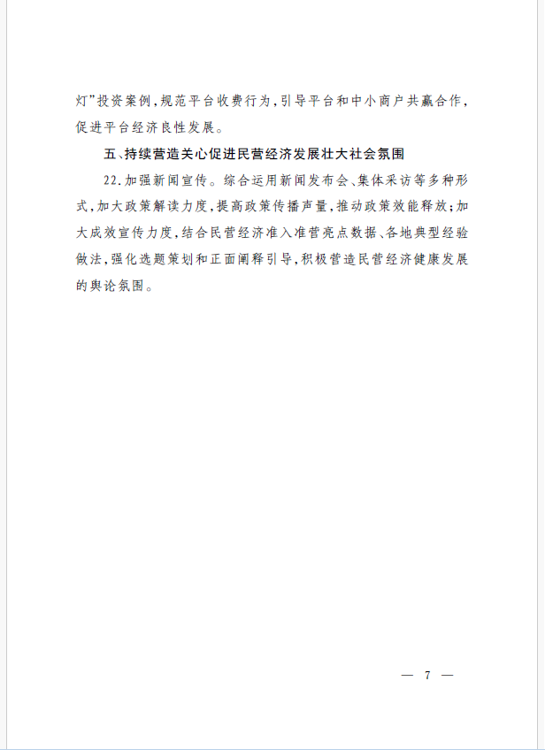 22條舉措聚焦五個方面,落實《意見》部署要求,回應(yīng)了民營經(jīng)濟各類關(guān)切:一是持續(xù)優(yōu)化民營經(jīng)濟發(fā)展環(huán)境。持續(xù)破除市場準(zhǔn)入壁壘,全面落實公平競爭政策制度,強化制止濫用行政權(quán)力排除、限制競爭的反壟斷執(zhí)法,完善社會信用激勵約束機制,健全失信行為糾正后的信用修復(fù)機制。二是加大對民營經(jīng)濟政策支持力度。完善信用信息歸集共享,健全中小微企業(yè)和個體工商戶信用評級和評價體系。完善支持政策直達(dá)快享機制。三是強化民營經(jīng)濟發(fā)展法治保障。持續(xù)完善知識產(chǎn)權(quán)保護體系,完善監(jiān)管執(zhí)法體系,杜絕選擇性執(zhí)法,健全涉企收費長效監(jiān)管機制。四是著力推動民營經(jīng)濟實現(xiàn)高質(zhì)量發(fā)展。支持民營企業(yè)參與標(biāo)準(zhǔn)制定,計量服務(wù)中小企業(yè)。依法規(guī)范和引導(dǎo)民營資本健康發(fā)展,推動平臺經(jīng)濟健康發(fā)展。五是持續(xù)營造關(guān)心促進(jìn)民營經(jīng)濟發(fā)展壯大社會氛圍,及時推廣經(jīng)驗做法,加大宣傳。