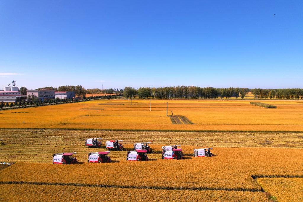 黑龍江省綏化市北林區(qū)的水稻科技示范田里正在進行收獲作業(yè)。新華社發(fā)(蔣寶棟攝)