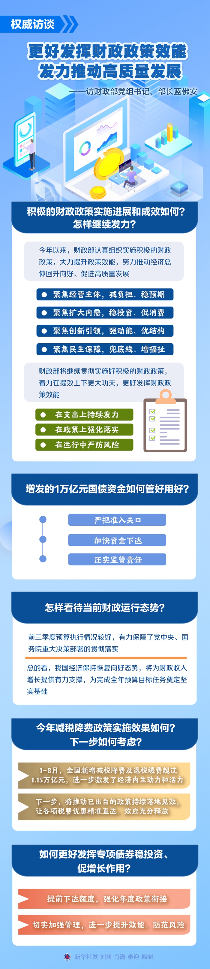 財政政策是國家宏觀調(diào)控的重要手段。下一步,財政政策還將如何發(fā)力?增發(fā)的國債怎樣用好?財政運(yùn)行態(tài)勢如何?新華社記者采訪了財政部黨組書記、部長藍(lán)佛安。