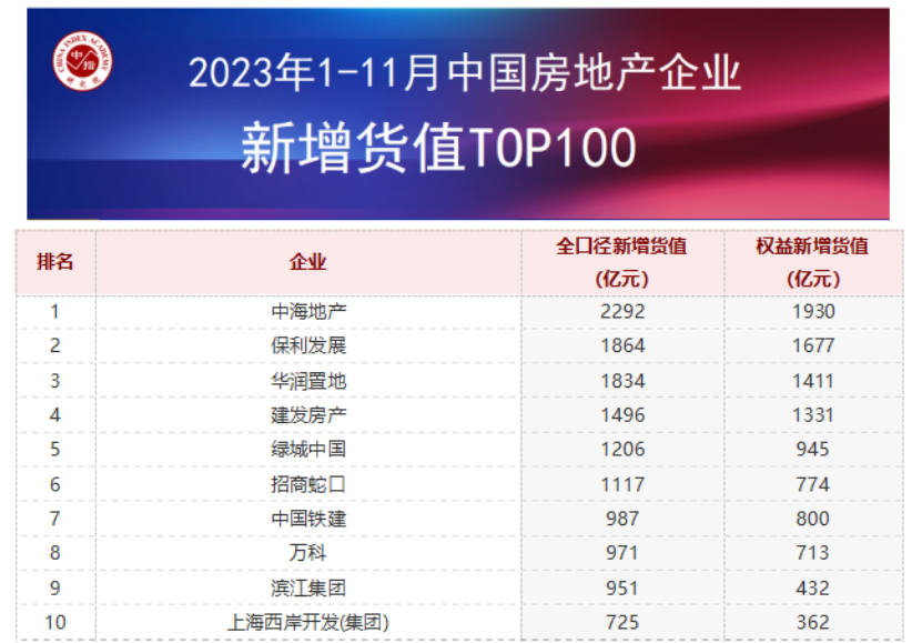 根據(jù)中指研究院數(shù)據(jù)顯示,中海地產(chǎn)、保利發(fā)展、華潤(rùn)置地占據(jù)新增貨值榜單前三位。2023年1-11月,中海地產(chǎn)以累計(jì)新增貨值2292億元占據(jù)榜單第一;保利發(fā)展、華潤(rùn)置地緊隨其后,累計(jì)新增貨值規(guī)模分別為1864億元和1834億元。TOP10企業(yè)2023年1-11月新增貨值總額13442億元,占TOP100企業(yè)的41.7%;TOP100企業(yè)新增貨值門檻為121億元。