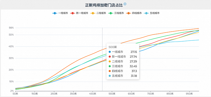 從極海品牌監(jiān)測(cè)的數(shù)據(jù)來(lái)看,在門(mén)店占比超過(guò)50%的三四五線(xiàn)城市里,正新門(mén)店位于“已有門(mén)店周?chē)?00米”距離的“加密門(mén)店”的占比都超過(guò)30%,其中,四線(xiàn)城市甚至超過(guò)37%。在深圳,界面新聞留意到,在華強(qiáng)北附近,也依然存在正新雞排相距100米“緊挨”著開(kāi)店的現(xiàn)狀。
