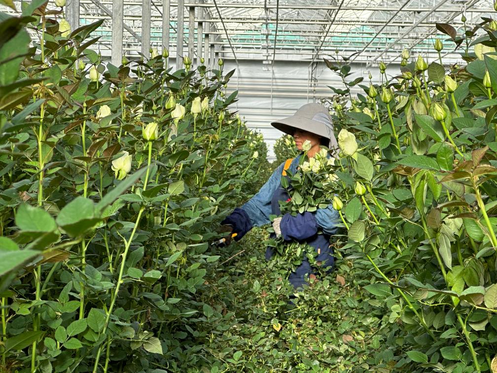 脫去厚重的外套,張小紅換上輕便的工作服,戴好手套和帽子,拿起大剪刀,開始了一天的剪花工作。只見她走進(jìn)幽深窄密的綠色長廊,直到看不見人影。少許時刻,她便抱著一大捧玫瑰走了出來,新鮮的露水從嬌嫩的花瓣上滴落。平板車?yán)锸M清水,她和其他工人們一起,將新鮮采摘的玫瑰用網(wǎng)紗細(xì)心地裹好,然后放置水中。再過不久,這些玫瑰將被運往全國各地甚至海外,為人們帶來愉悅和享受。