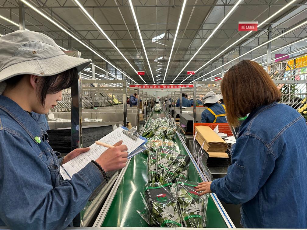 張小紅的同事在鮮花港玫瑰工廠包裝玫瑰。 新華社記者 胡偉杰 攝