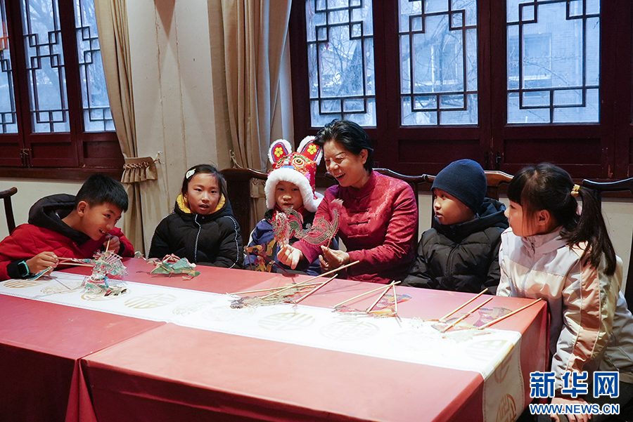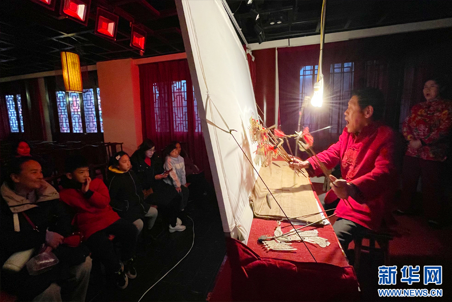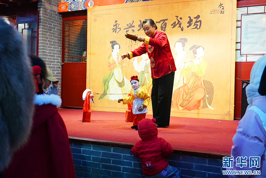 在西安永興坊——陜西非遺文化特色街區(qū),今年56歲的王春桃,為小朋友們表演國(guó)家級(jí)非遺合陽(yáng)提線(xiàn)木偶戲《賣(mài)雜貨》。 新華網(wǎng) 楊喜龍 攝
