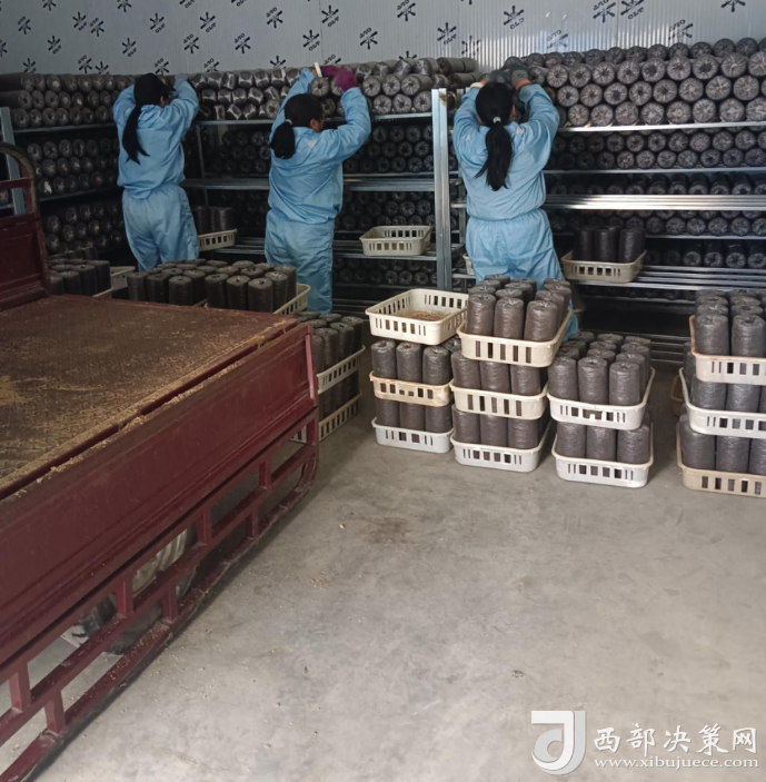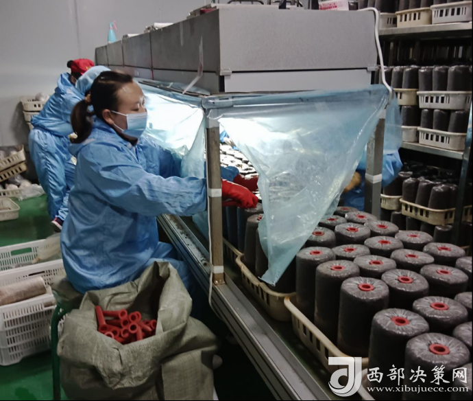 伴隨著機械的聲響,菌棒生產車間里的工人們忙中有序,一堆堆木屑通過攪拌、裝袋、滅菌、接種等工序,變成了一個個菌棒,源源不斷地走下生產線,走進養(yǎng)菌室,孕育著致富的希望。