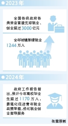 2023年,全國(guó)各級(jí)政府各類資金直接支持就業(yè)、創(chuàng)業(yè)超過3000億元,并采取支持高校畢業(yè)生等青年就業(yè)、城鄉(xiāng)困難群眾就業(yè)等針對(duì)性措施,全年城鎮(zhèn)新增就業(yè)1244萬(wàn)人。