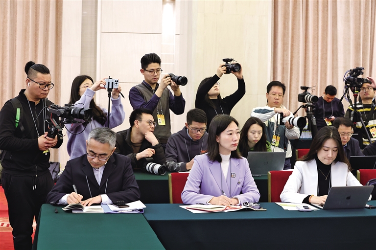 3月6日,中外媒體記者走進(jìn)北京人民大會(huì)堂,參加十四屆全國人大二次會(huì)議陜西代表團(tuán)媒體開放日活動(dòng)。圖為記者在活動(dòng)現(xiàn)場采訪。記者 母家亮攝
