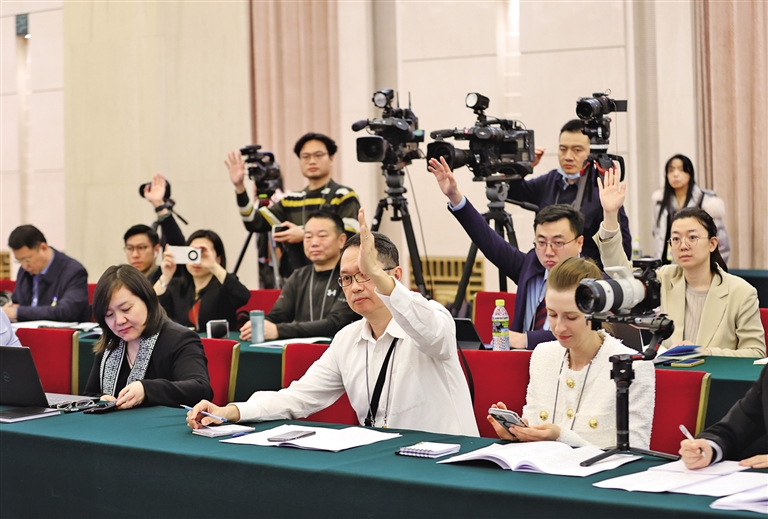 三月六日,中外媒體記者走進(jìn)北京人民大會(huì)堂,參加十四屆全國人大二次會(huì)議陜西代表團(tuán)媒體開放日活動(dòng)。圖為記者舉手爭取提問機(jī)會(huì)。 記者 母家亮攝