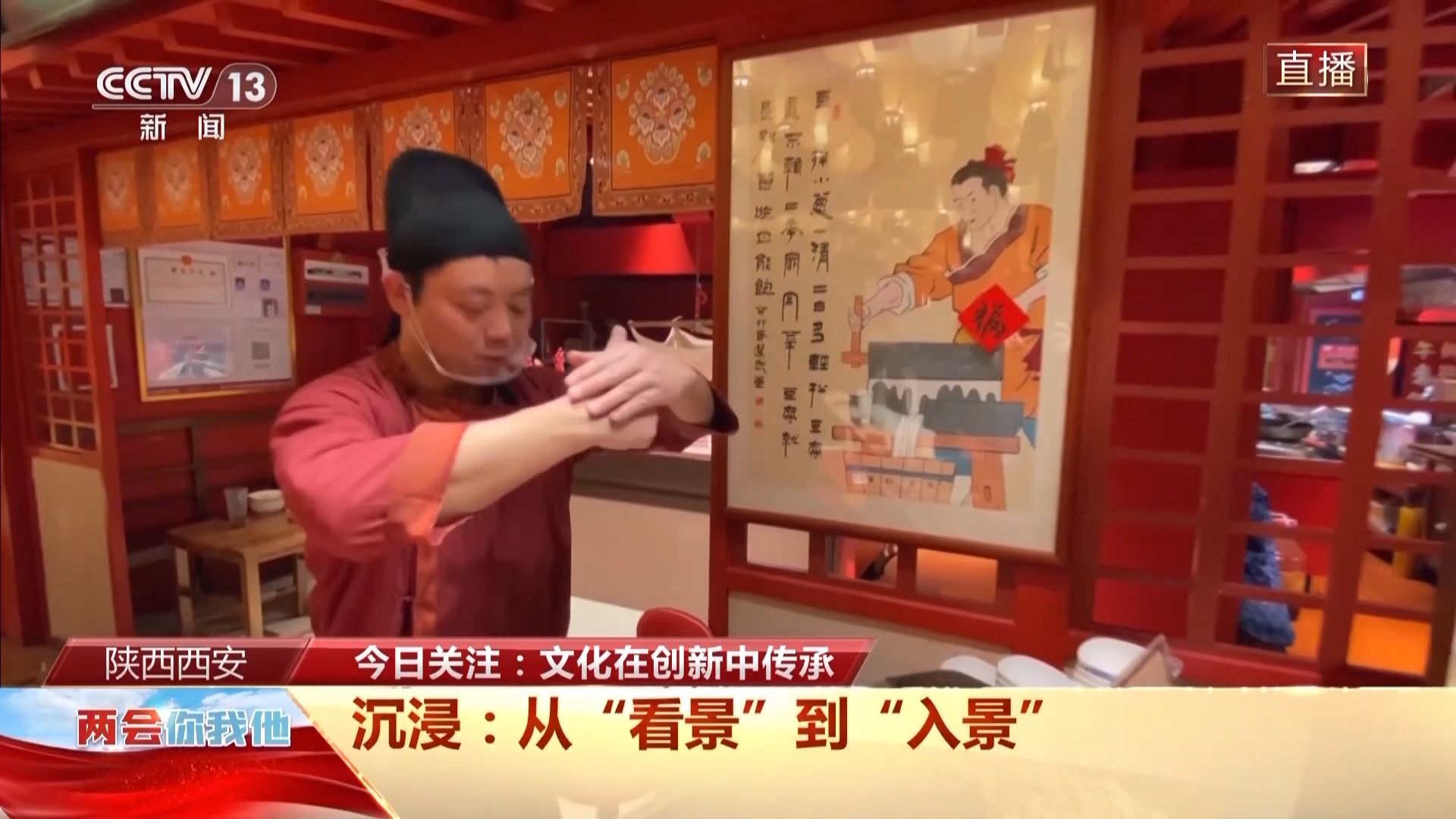 首先是沉浸,從游客一踏進(jìn)主題街區(qū)就開始了。游客首先要跟工作人員學(xué)習(xí)唐朝人見面相互問候的禮節(jié),叫叉手禮。在電影《長(zhǎng)安三萬里》中,主人公們相互打招呼用的就是這樣的叉手禮。
