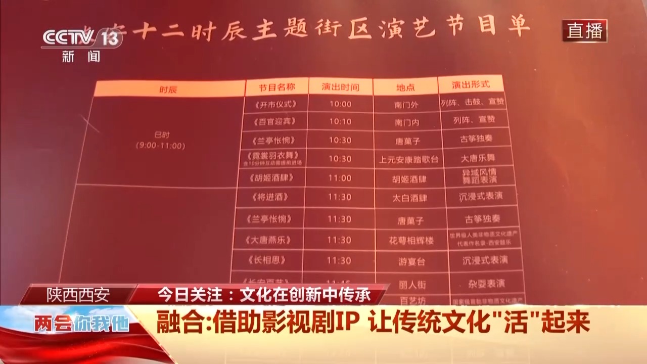 除了道具,這樣的一個(gè)主題街區(qū),小型互動(dòng)表演遍布,這個(gè)節(jié)目單從早上10時(shí)的開市儀式一直到晚上10時(shí)的互動(dòng)演繹,全天有70多場(chǎng)演出,旺季最多的時(shí)候有上百場(chǎng)演出。很多都是互動(dòng)式的表演,比如太白酒肆里,李白的《將進(jìn)酒》一出,總會(huì)出現(xiàn)現(xiàn)場(chǎng)齊誦的熱烈場(chǎng)面。這個(gè)春天,五湖四海游客齊誦唐詩(shī)的場(chǎng)景,已經(jīng)成為西安的一道新風(fēng)景。