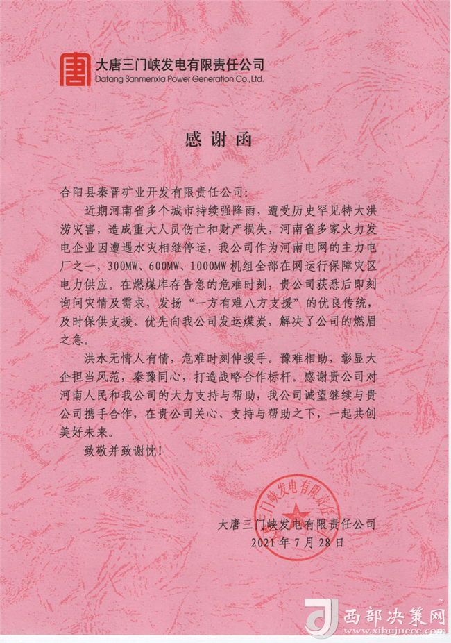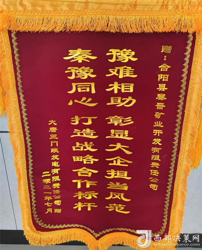 近日,大唐三門峽發(fā)電有限公司為秦晉集團(tuán)公司送來了感謝函,并將一面寫有“豫難相助,彰顯大企擔(dān)當(dāng)風(fēng)范,秦豫同心,打造戰(zhàn)略合作標(biāo)桿”的錦旗送到了秦晉集團(tuán)公司,對(duì)秦晉集團(tuán)“一方有難八方支援”的大愛精神表示感謝!(圖/文:聶曉英)